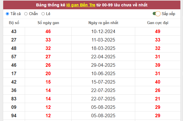 Bảng thống kê đầu giải đặc biệt Bến Tre lâu chưa về nhất tính đến ngày hôm nay: Đầu 0 gan 2 ngày – Đầu 1 gan 1 ngày – Đầu 2 gan 6 ngày – Đầu 3 gan 32 ngày – Đầu 4 gan 30 ngày – Đầu 5 gan 7 ngày – Đầu 6 gan 10 ngày – Đầu 7 gan 3 ngày – Đầu 8 gan 28 ngày – Đầu 9 gan 0 ngày.