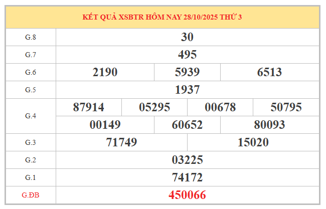 Trước khi tiến hành dự đoán XSBTR ngày 4 tháng 11 năm 2025, điều quan trọng là nhìn lại kết quả kỳ quay gần nhất để tìm ra những quy luật và dấu hiệu nổi bật. Dữ liệu thống kê từ kỳ trước ghi nhận sự phân bổ khá cân bằng giữa các đầu và đuôi số, trong đó đầu 9 và đuôi 9 chiếm tần suất xuất hiện cao nhất.